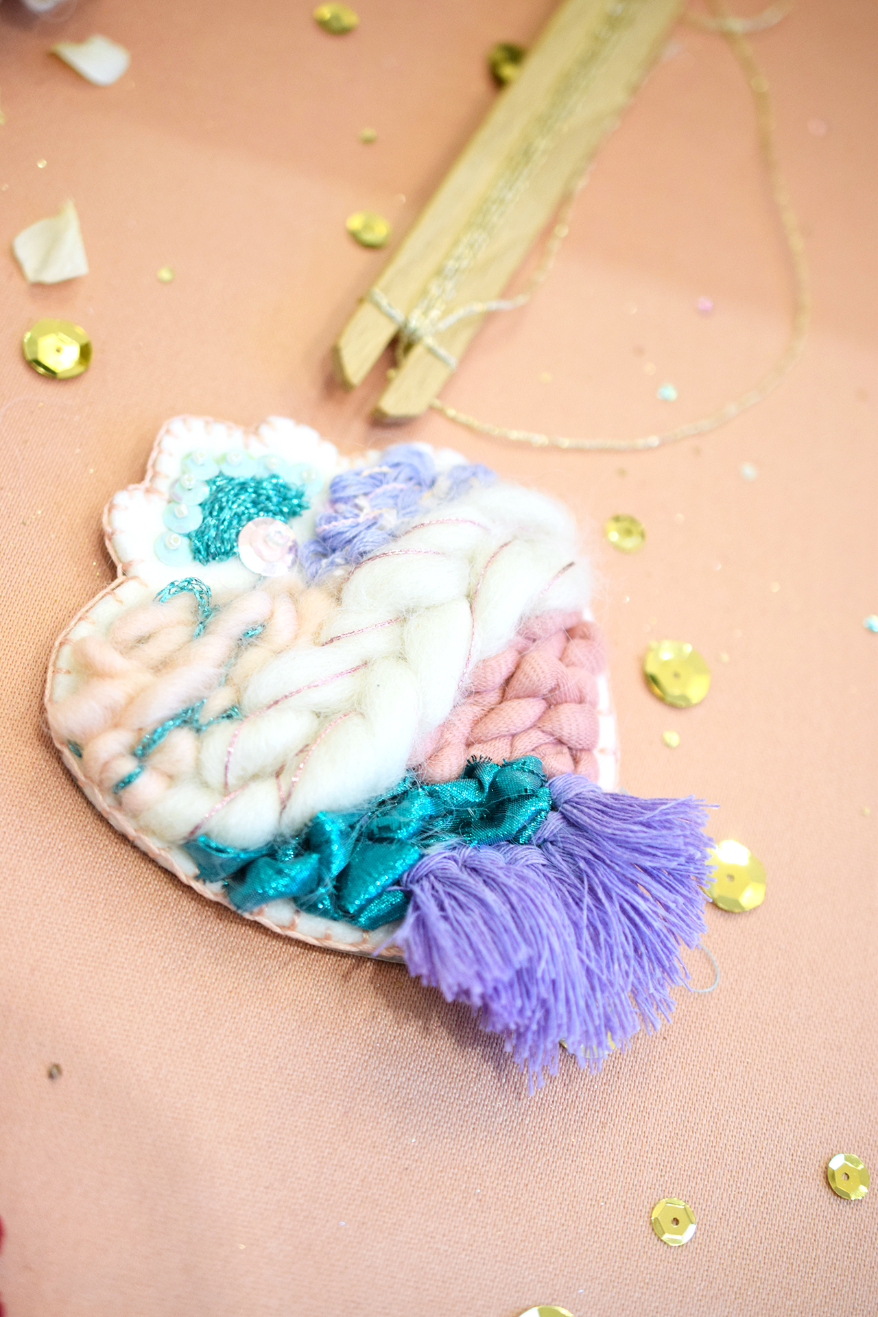 Pendant cet atelier vous découvrirez les base du tissage sur un support en feutrine épaisse à laquelle vous pourrez donner la forme de votre choix. Ensuite laissez parler votre créativité en mêlant fils de coton, Lurex, laine cardée, perles et sequins pour créer votre décoration unique !